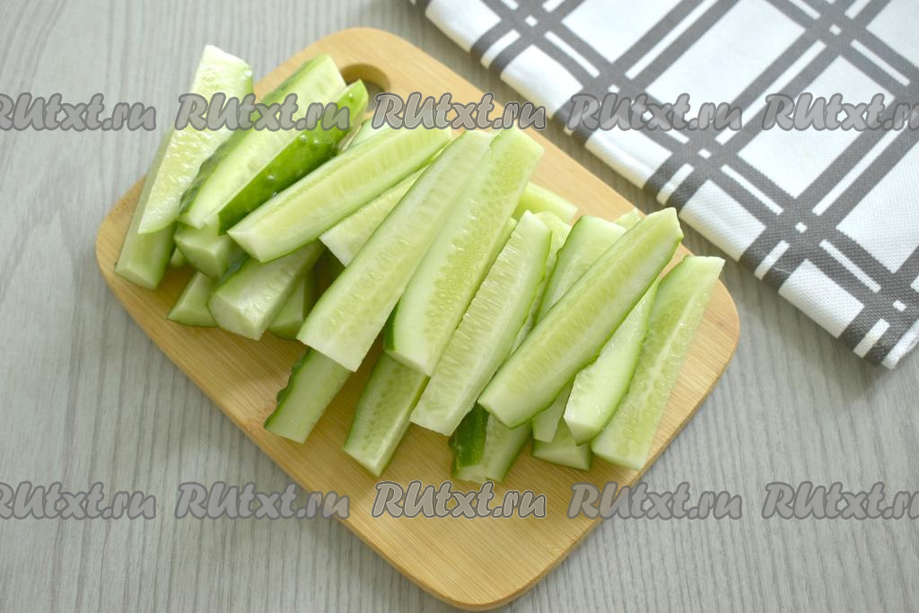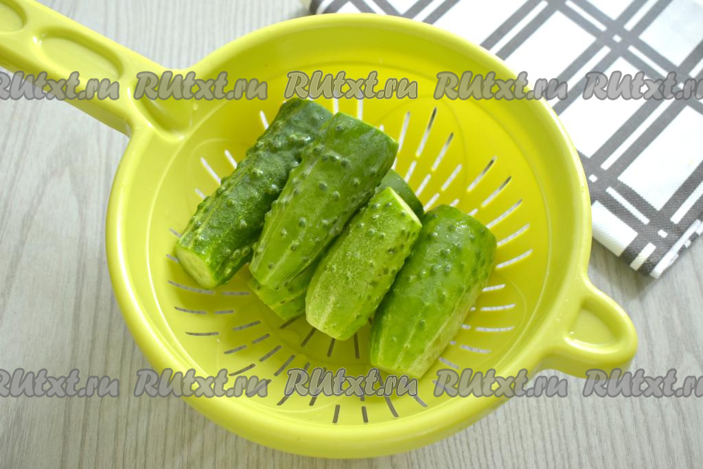 Для этого блюда я предпочитаю использовать небольшое количество огурцов, чтобы закуску можно было съесть за 1-2 раза. Желательно брать примерно одинаковые огурчики среднего размера. Тщательно моем огурцы, срезаем кончики с двух сторон.