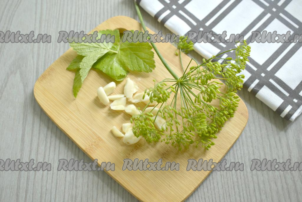Слегка придавливаем очищенные зубчики чеснока тыльной стороной ножа, а затем нарезаем на пластинки. Промываем зонтик укропа и листики смородины.