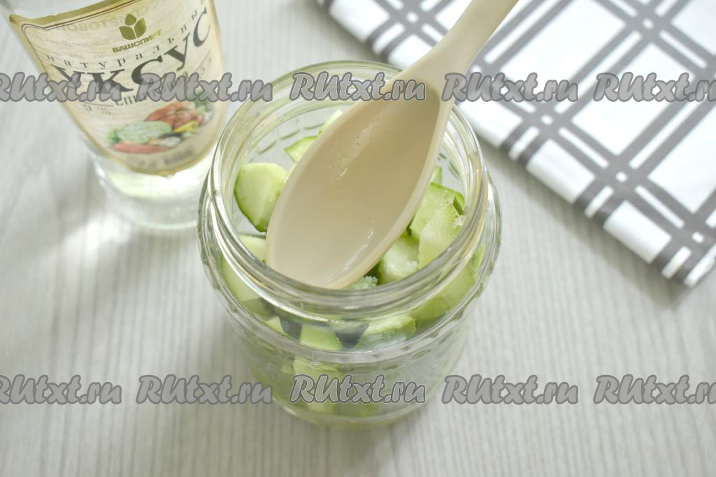 Банку с огурцами закрываем капроновой крышкой и хорошо несколько раз встряхиваем, чтобы соль и уксус распределились по всем огурцам.