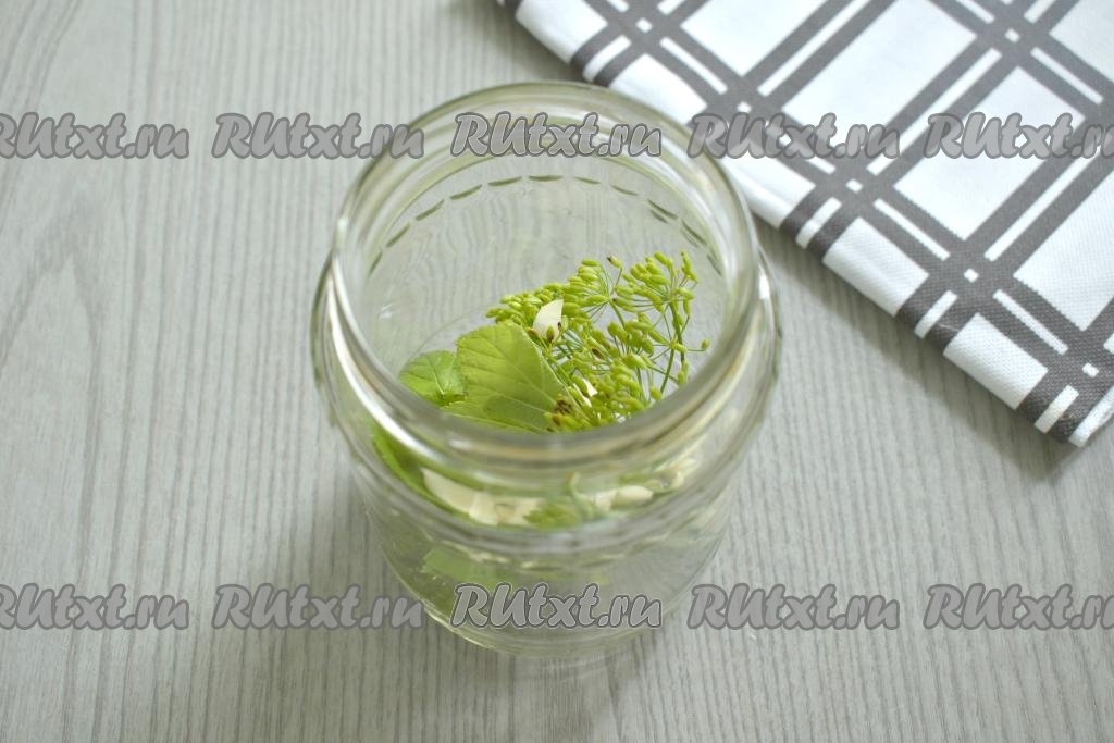 В сухую чистую банку (я взяла банку объёмом 750 миллилитров) помещаем зонтик укропа и листья смородины, добавляем нарезанный чеснок.