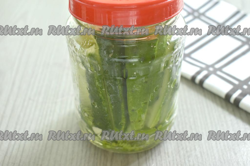 Ставим банку с огурцами в холодильник на сутки. В течение этого времени каждые 3-4 часа банку достаём из холодильника и хорошо встряхиваем. Огурцы в процессе маринования выделят небольшое количество сока.