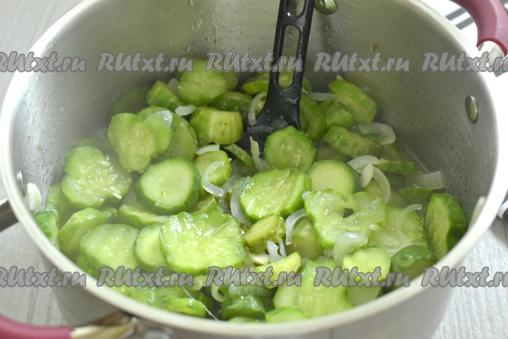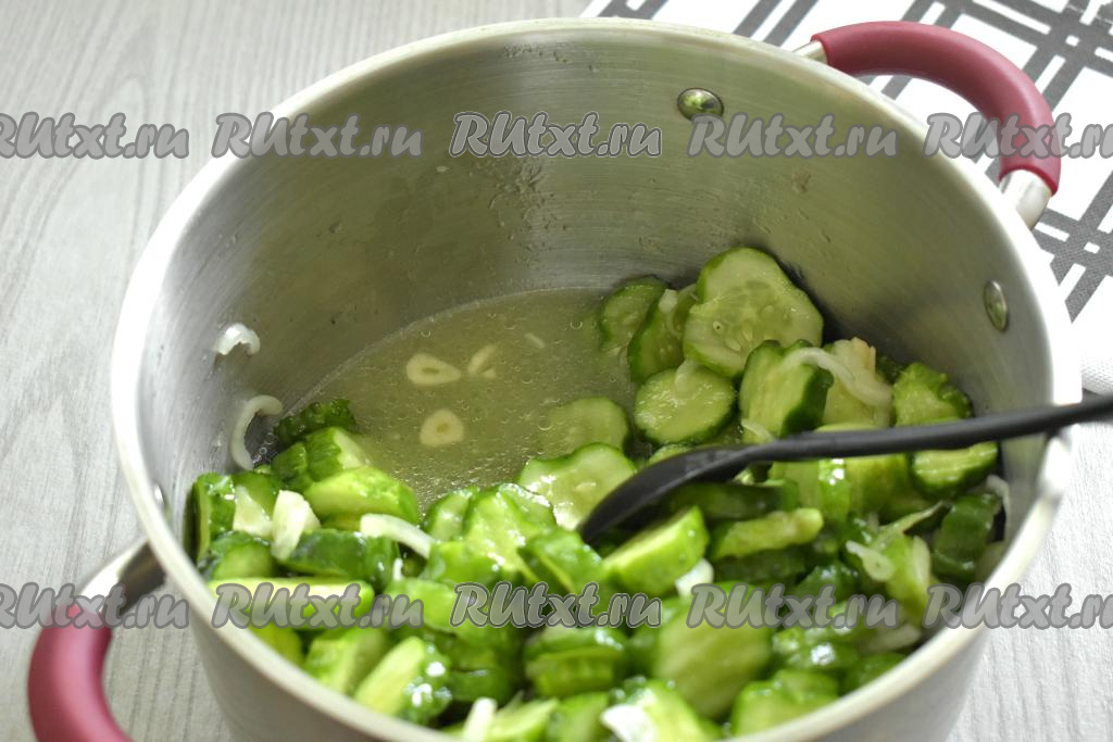 Через 3 часа огурцы с луком и чесноком вместе с выделившимся соком перекладываем в кастрюлю с толстым дном, ставим на средний огонь.