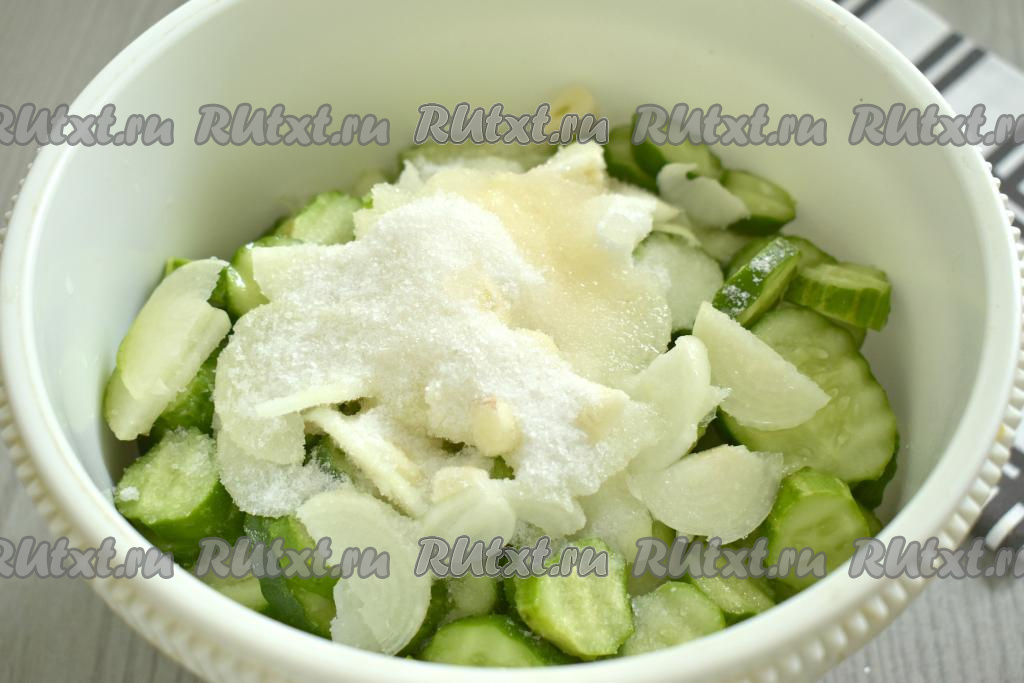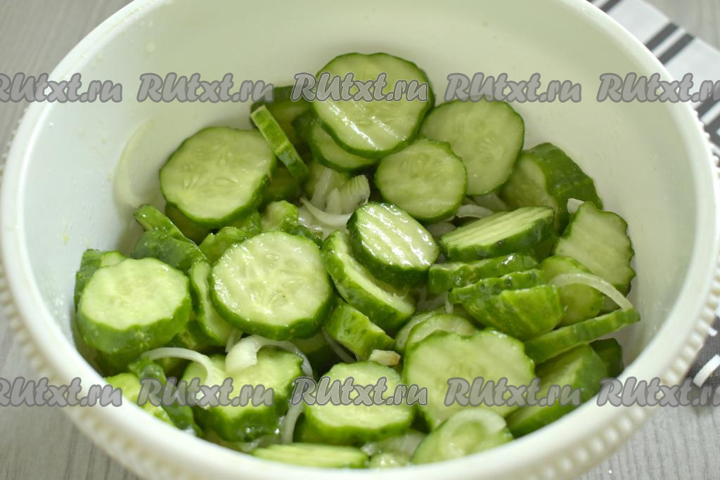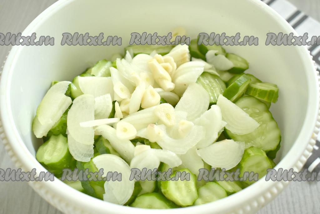 Миску с огурцами, луком и чесноком накрываем крышкой (или затягиваем пищевой плёнкой) и оставляем при комнатной температуре на 3 часа, за это время 3-4 раза овощи перемешиваем. Огурцы за это время выделят достаточно много сока.