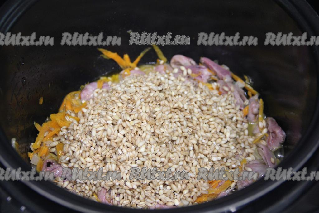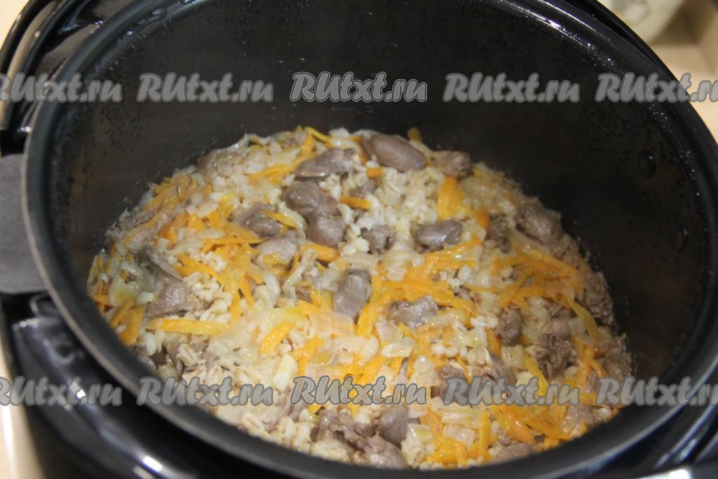 Затем в чашу мультиварки с куриным сердечками, обжаренными с овощами, добавить подготовленную перловку.