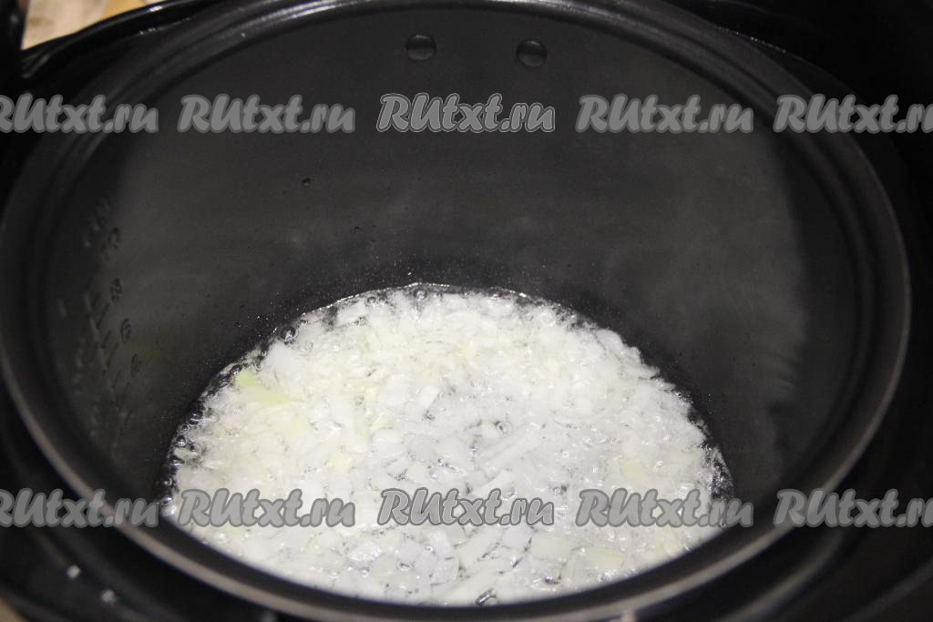 В чашу мультиварки влить растительное масло, выставить режим "Жарка" на 15 минут. Лук мелко нарезать, добавить в чашу мультиварки, обжарить в течение 5 минут, иногда помешивая.