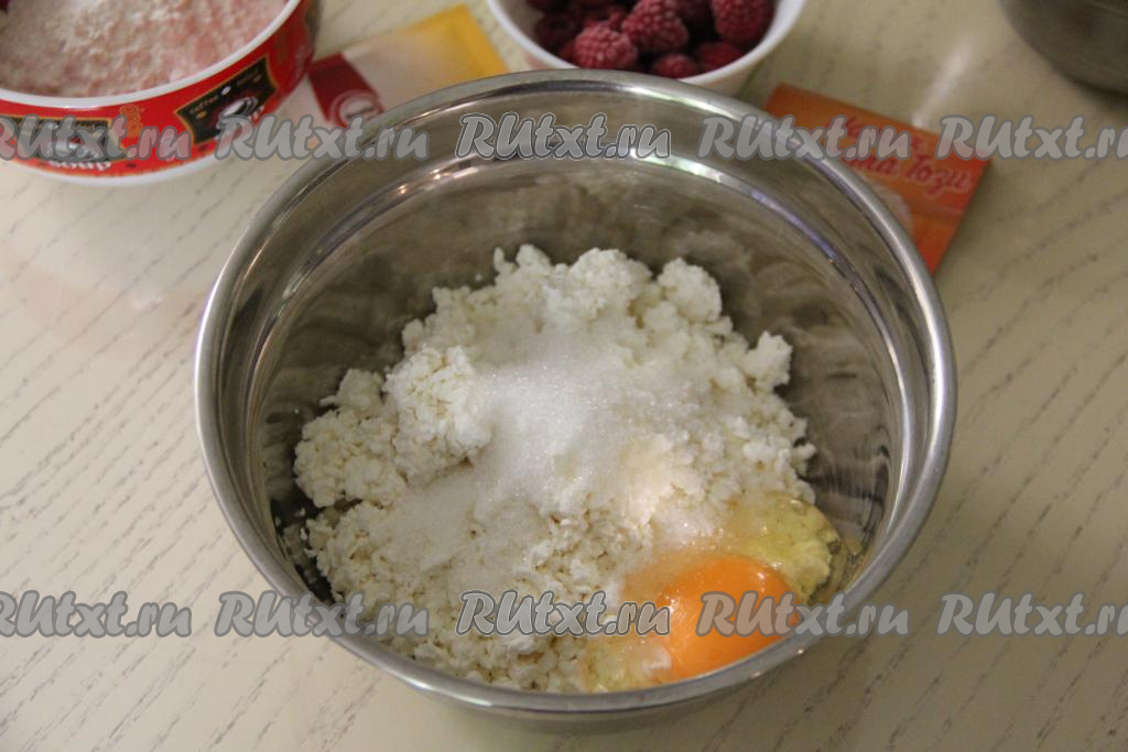 Прежде всего замесим творожное тесто, для этого нужно соединить в миске творог, сахар и яйцо.