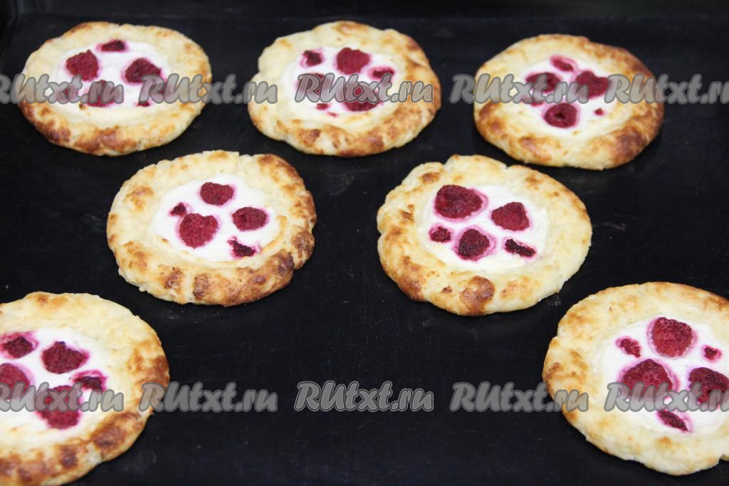 Поверх начинки на каждую ватрушку выложить 3-4 ягоды, слегка утапливая ягодки в творожную массу.