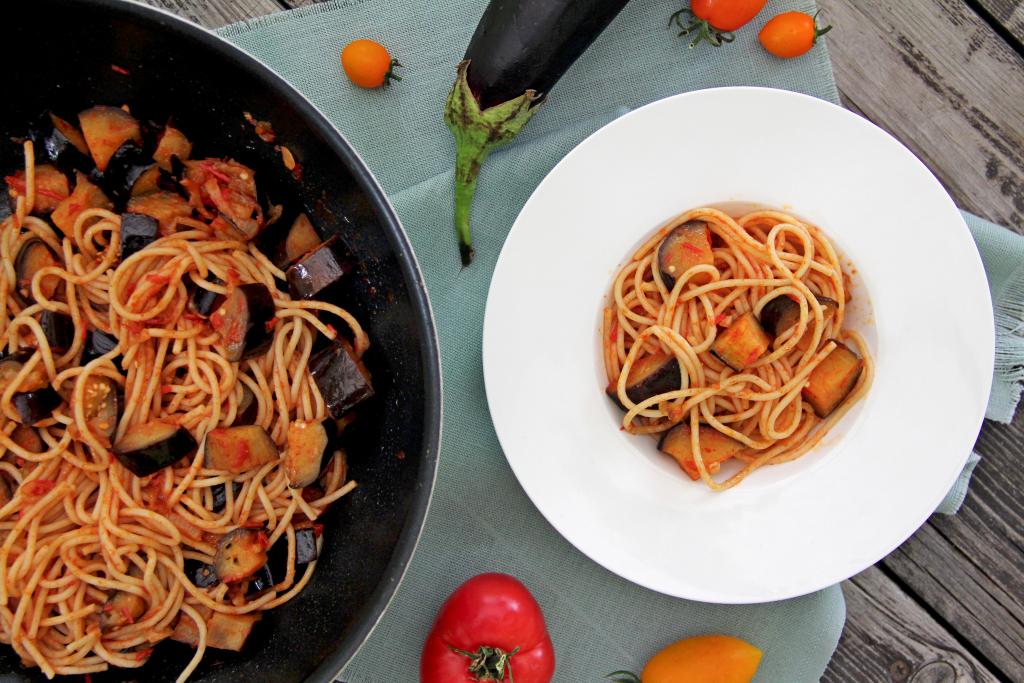 Спагетти с баклажанами и помидорами
