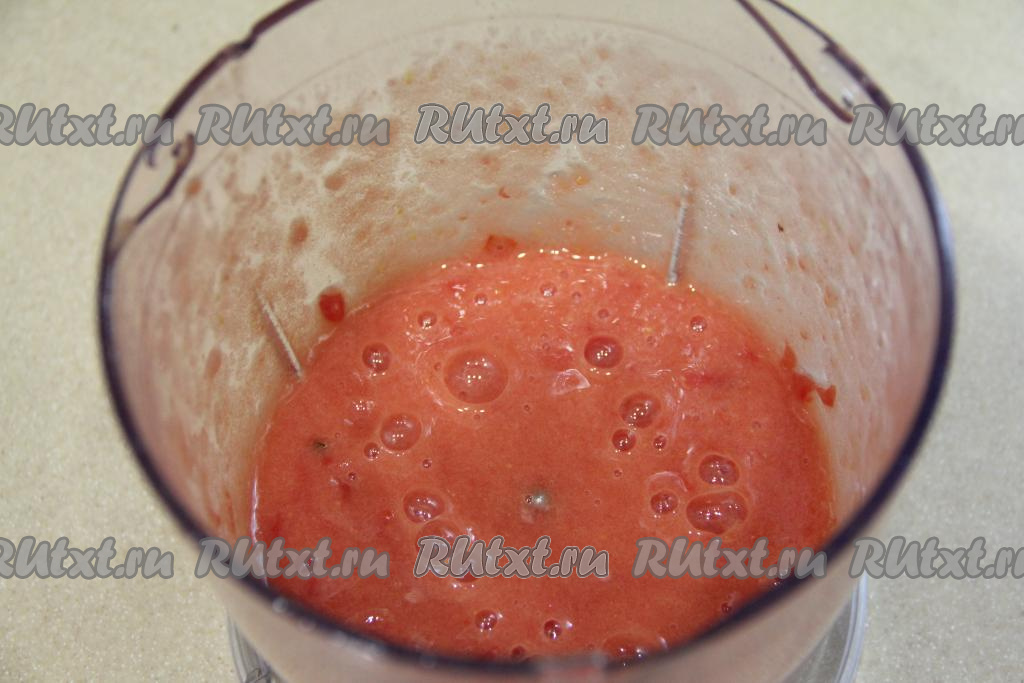 Помидоры (по желанию, предварительно их можно очистить от кожуры) с помощью измельчителя (или погружного блендера) пробить до получения однородного томатного пюре.
