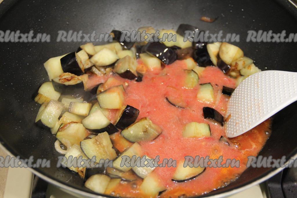 После того как баклажаны обжарятся в течение 10 минут, добавить в сковороду получившееся томатное пюре, перемешать.