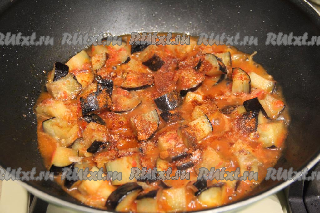 Посолить баклажаны в томатном соусе по вкусу, приправить любимыми специями (например, можно добавить чёрный молотый перец или паприку).