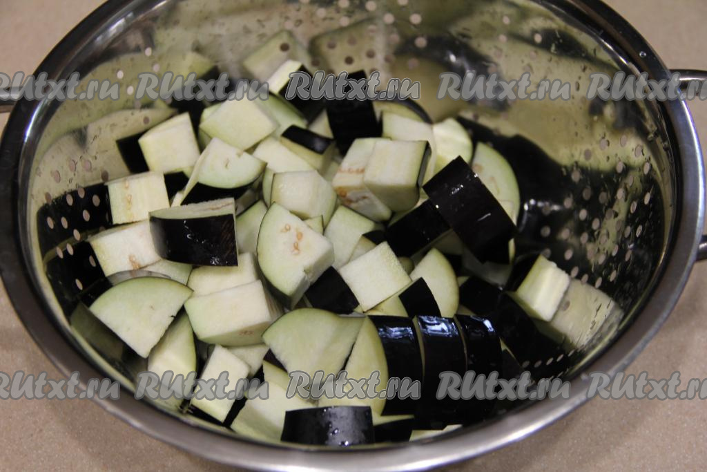 Баклажаны нарезать на средние кубики. В миску влить 500 миллилитров холодной воды, всыпать 0,5 столовой ложки соли, перемешать, выложить нарезанные баклажаны, перемешать и оставить минут на 30. Затем откинуть баклажаны на сито, промыть холодной водой, лишней воде дать стечь, оставить на несколько минут, чтобы баклажаны немного обсохли. В процессе замачивания и промывания из баклажанов уйдёт горечь, которая зачастую бывает в этих овощах.