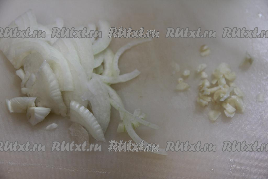 Очищенный лук нарезать на полукольца (или четверть кольца). Очищенные зубчики чеснока мелко нарезать.