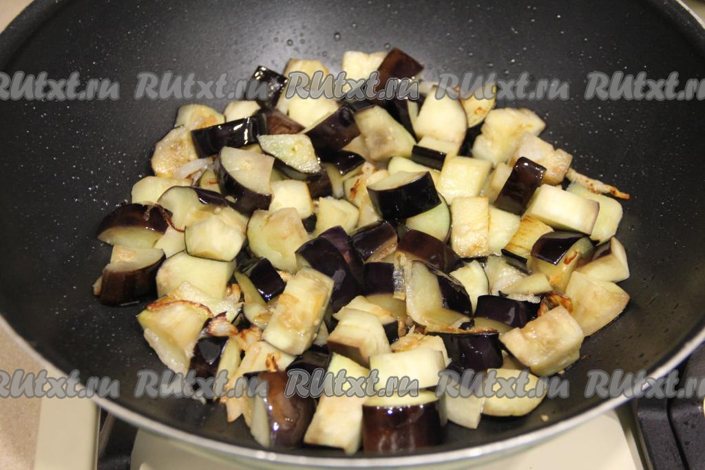 К обжаренным луку и чесноку выложить баклажаны, перемешать.