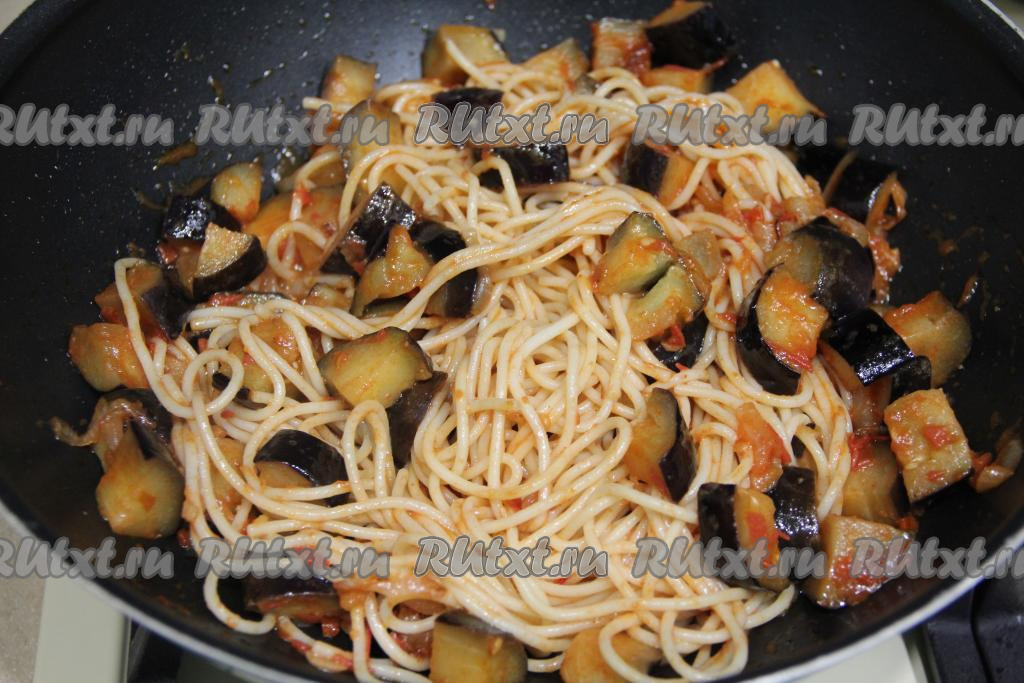 Затем к баклажанам, протушившимся в соусе из помидоров, добавить отваренные спагетти.