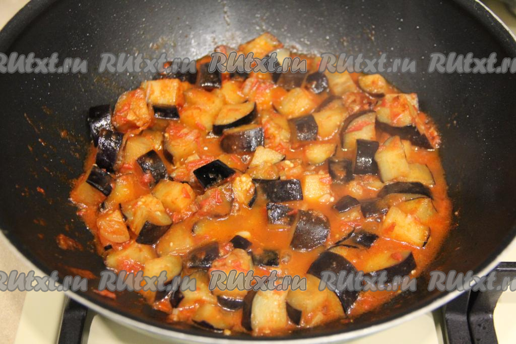 Перемешать, довести томатный соус до кипения, уменьшить до минимума огонь и тушить баклажаны минут 5, иногда помешивая.