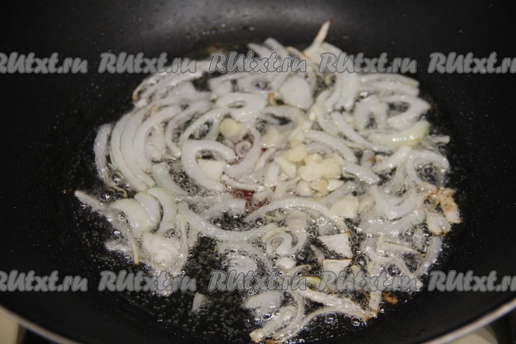 В сковороду влить немного растительного масла, разогреть, выложить лук и чеснок, обжарить на среднем огне в течение 4 минут (до прозрачности лука), иногда помешивая.