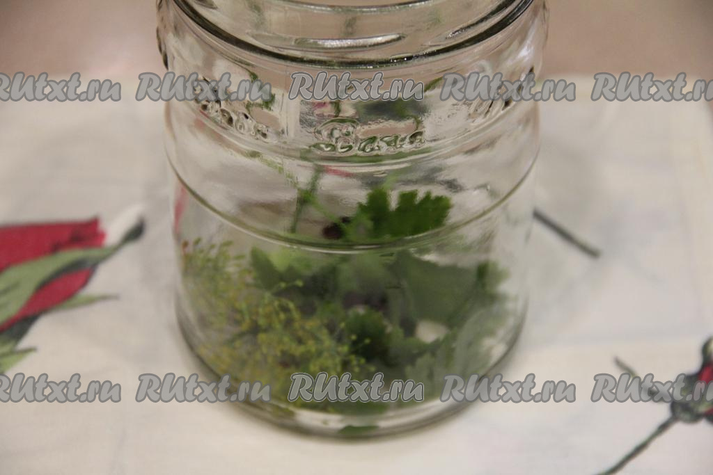 Банки и крышки предварительно простерилизовать любым удобным способом. Я взяла 2 банки объёмом по 1 литру и 1 баночку объёмом 500 миллилитров. На дно каждой банки выложить 1 лавровый лист, 1 зонтик укропа, 5-6 горошин чёрного перца, 2 зубчика чеснока и 1 веточку петрушки.