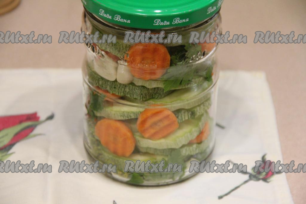 Оставшийся чеснок нарезать на дольки (не тонко). Выложить в банки кружочки кабачка вместе с кружочками моркови. Во время выкладывания овощей прослаиваем их веточками петрушки и дольками чеснока. Прикрыть банки заранее прокипячёнными крышками (я прокипятила крышки в течение 3 минут с момента закипания воды).