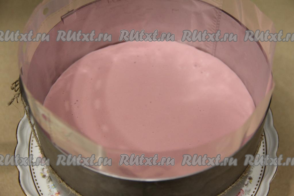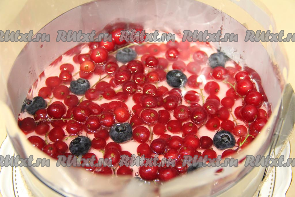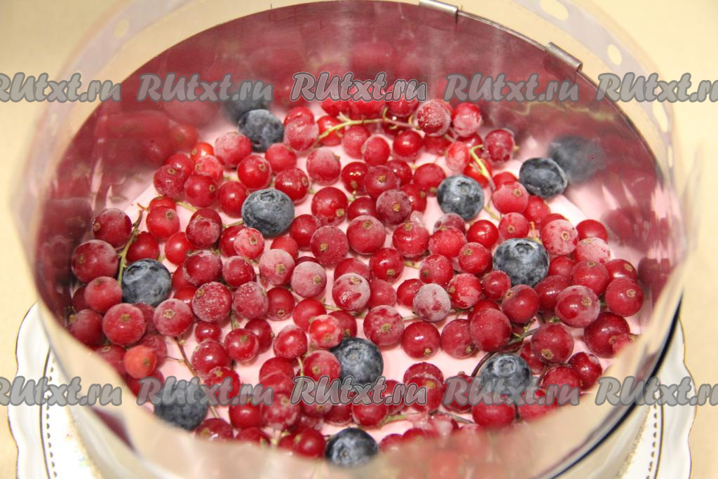 Получившуюся творожно-ягодную массу, смешанную с желатином, аккуратно вылить в форму поверх песочной основы чизкейка. Поставить форму в холодильник на пару часов (до полного застывания творожно-ягодного слоя).