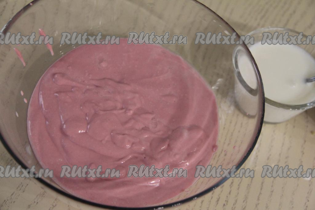 Перемешать молочно-желатиновую смесь и творожно-ягодную массу миксером. Масса получится не густой.