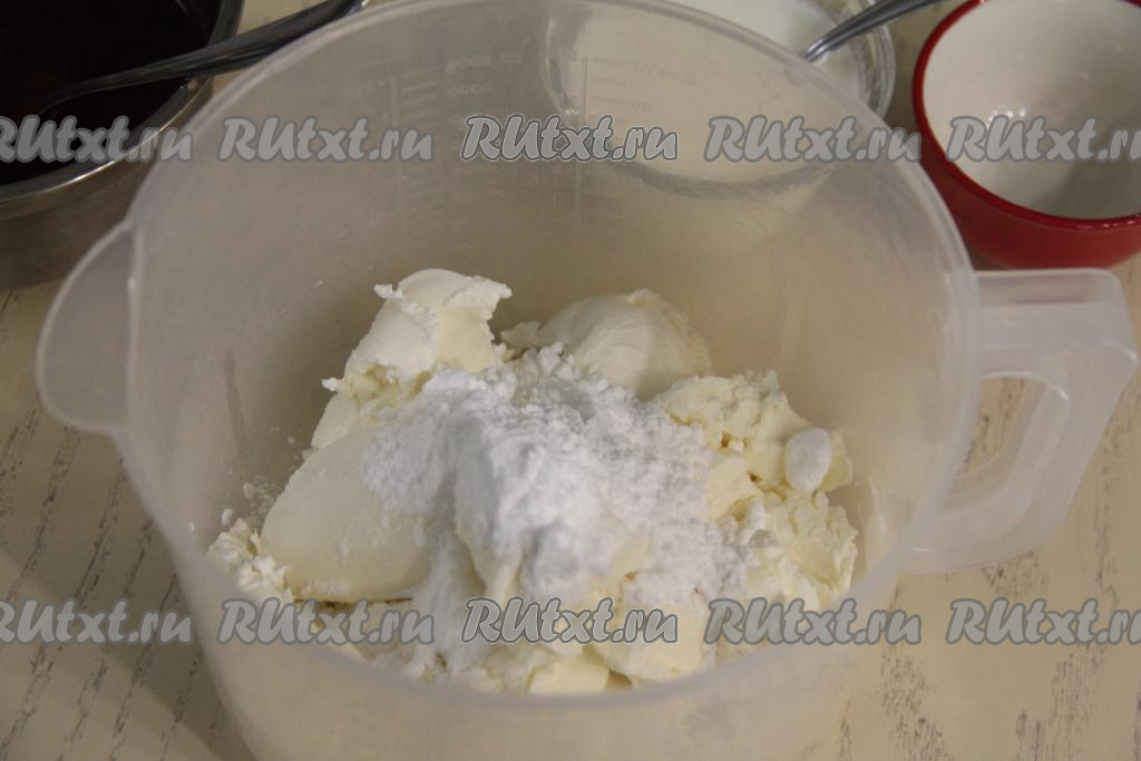 Пока основа чизкейка охлаждается, займёмся желейным слоем. Для этого в небольшую ёмкость нужно влить холодное молоко, всыпать желатин, тщательно перемешать и оставить набухать минут на 10-15. В чашу миксера выложить творожный сыр и сахарную пудру, перемешать миксером творожную массу до однородности.
