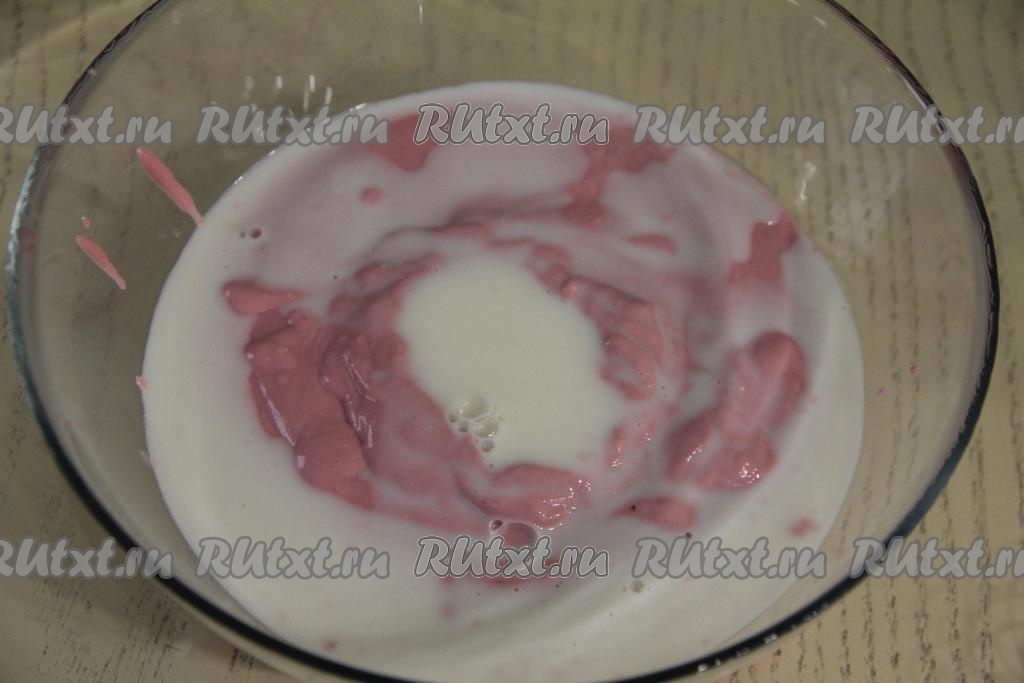 Можно прогреть молочно-желатиновую смесь, постоянно помешивая, на среднем огне. Но удобнее прогревать желатин в микроволновке, для этого ставим посуду с желатином в микроволновку на 10 секунд, затем вынимаем, перемешиваем и отправляем в микроволновку ещё на 10 секунд, снова перемешиваем. Если кристаллы желатина ещё растворились не полностью, тогда ставим в микроволновку ещё на 10 секунд. Очень важно, чтобы кристаллики желатина растворились, но при этом молочно-желатиновая смесь не закипела (если смесь закипит, желатин может потерять желирующие свойства). Именно поэтому важно прогревать желатин небольшими временными импульсами (по 10 секунд) и каждый раз обязательно перемешивать.