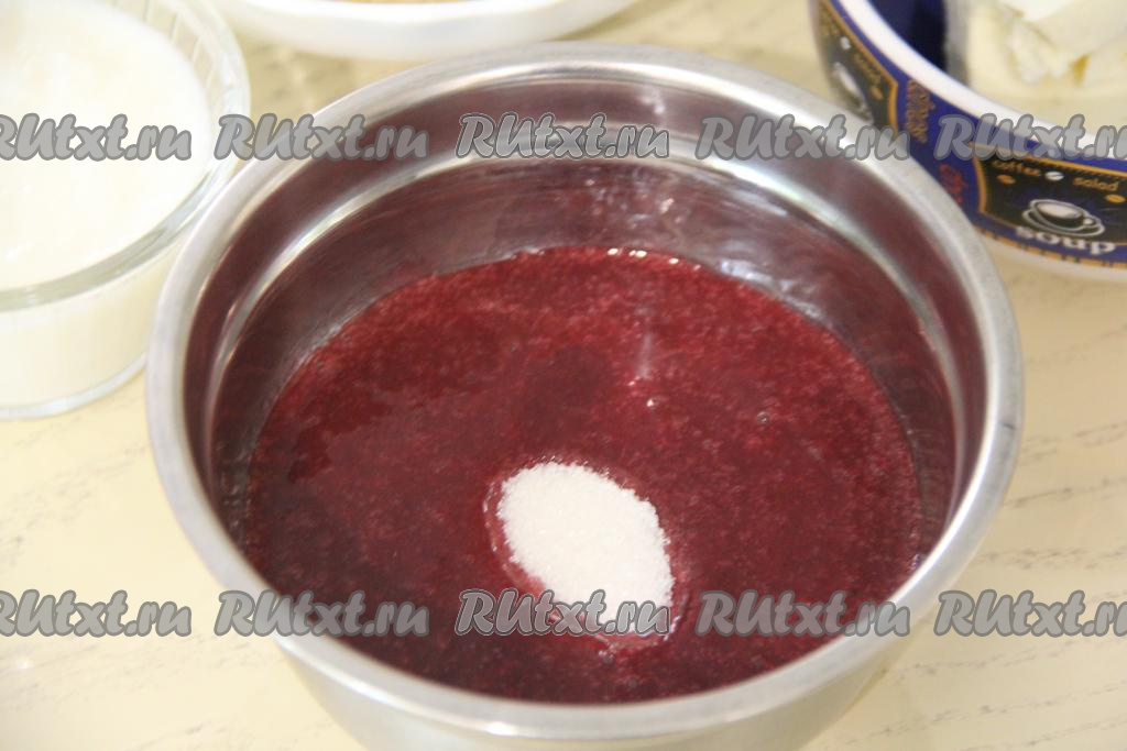В получившуюся творожную массу выложить пюре из чёрной смородины, смешанное с сахаром.