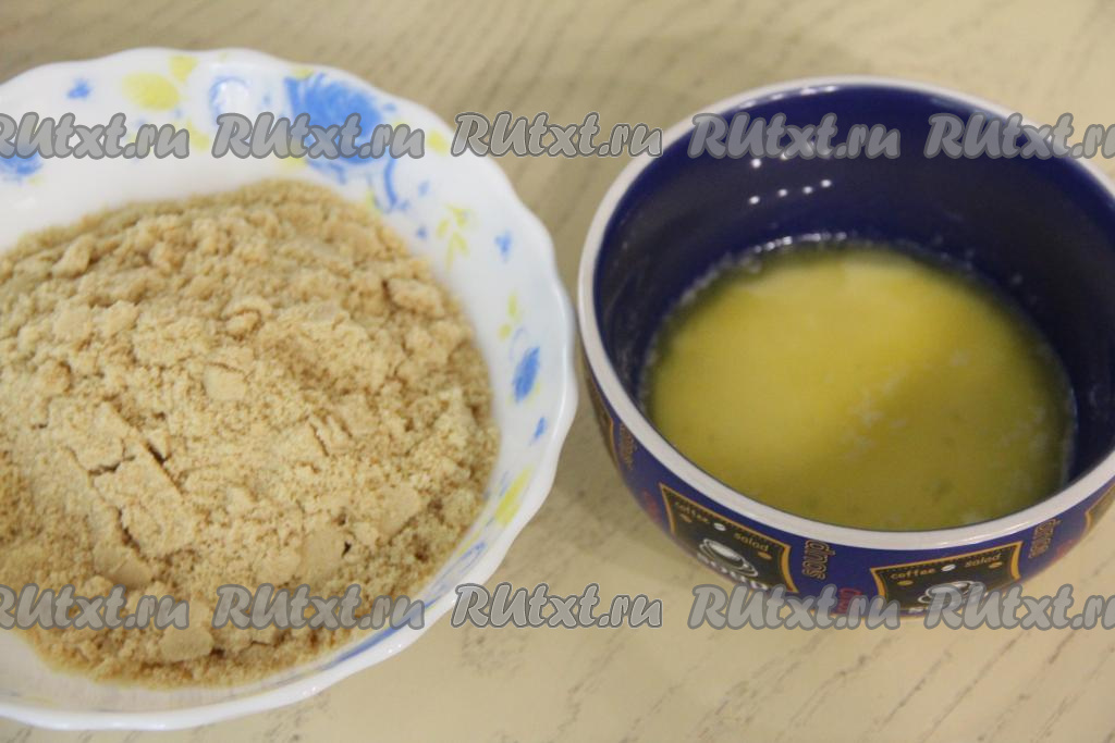 Печенье измельчить в крошку с помощью измельчителя (или поместить в обычный целлофановый пакет, завязать и прокатать поверх пакета скалкой, измельчая печенье в крошку). Сливочное масло растопить до жидкого состояния в микроволновке (или на плите).