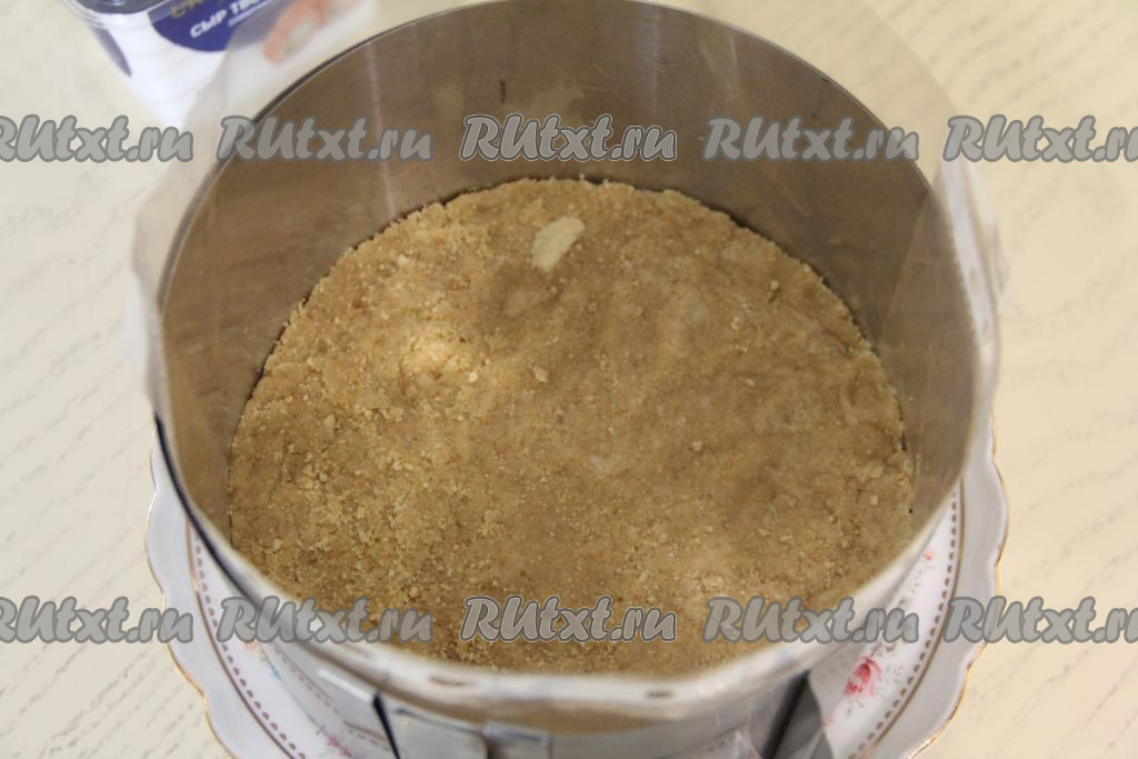 В глубокой тарелке соединить печенье, растопленное в крошку, и растопленное сливочное масло, перемешать. Выложить получившуюся массу на дно формы, в которой будете формировать чизкейк. Утрамбовать смесь масла и печенья, сформировав плоскую основу для чизкейка. Поставить форму в холодильник на 30 минут.