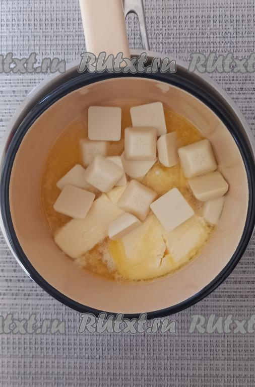 Шоколад поломать на кусочки. Сливочное масло положить в сотейник, добавить кусочки белого шоколада и, помешивая, растопить на водяной бане. Получившуюся смесь масла и шоколада остудить до комнатной температуры.