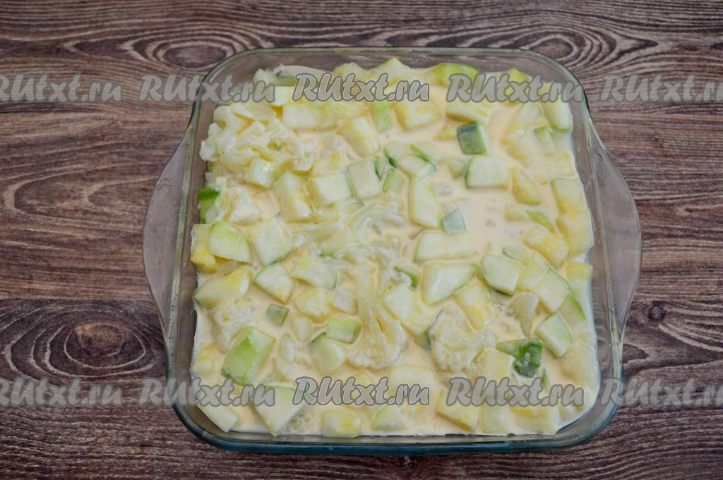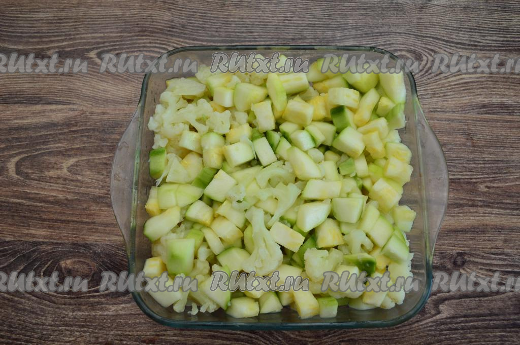 Смешать отваренную цветную капусту и кусочки кабачков, выложить в форму для запекания.