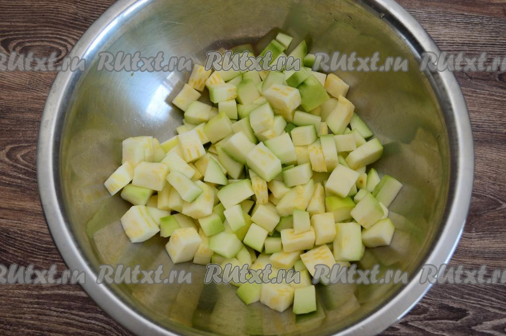 Кабачок очистить от кожуры. Нарезать кабачок на небольшие кубики, переложить в глубокую миску, посолить по вкусу, хорошо перемешать.