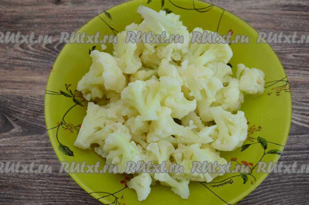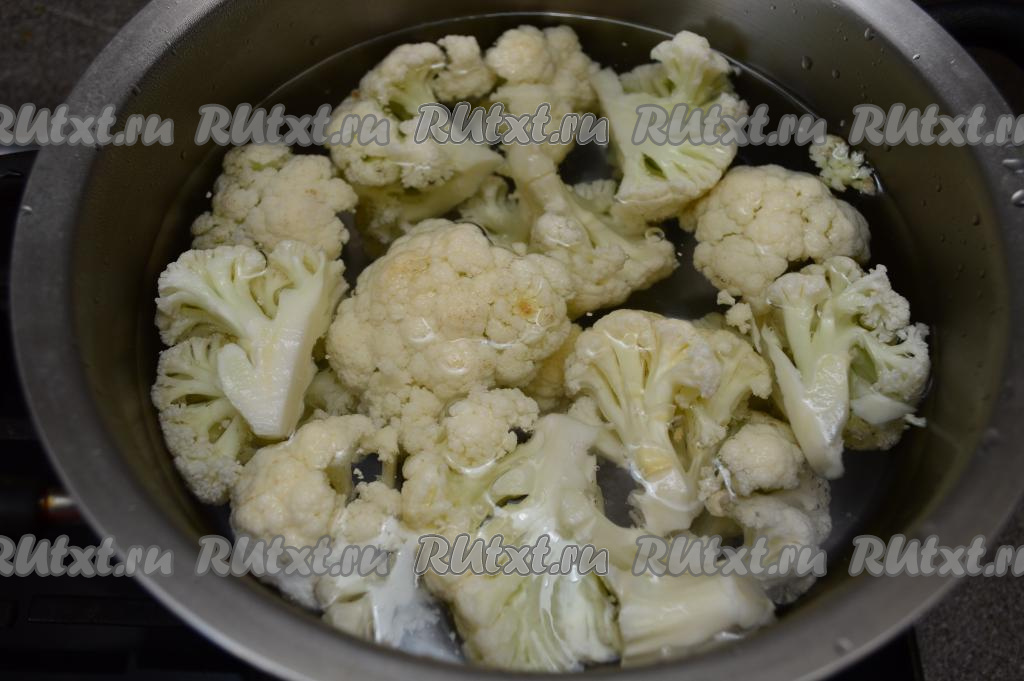 Первым делом нужно отварить цветную капусту. Для этого её нужно вымыть, нарезать на средние соцветия, поместить в кастрюлю с кипящей подсоленной водой и с момента закипания варить на небольшом огне до мягкости (примерно 6-8 минут). Отваренные соцветия должны легко прокалываться вилкой, но развариться они не должны.