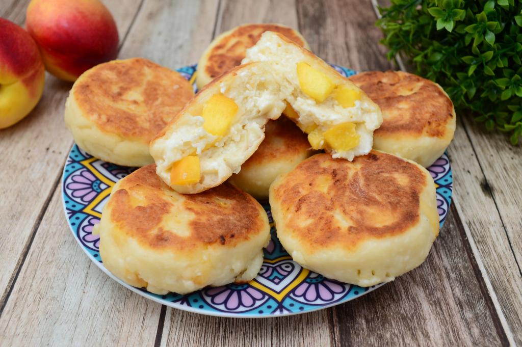 А вот как сырник выглядит в разломе. Сочетание нежного творожного теста и сочных кусочков нектарина делает вкус этих сырников незабываемым!