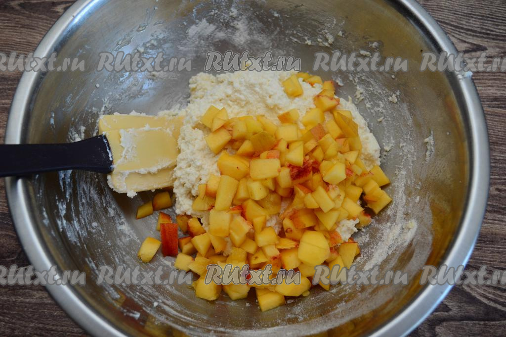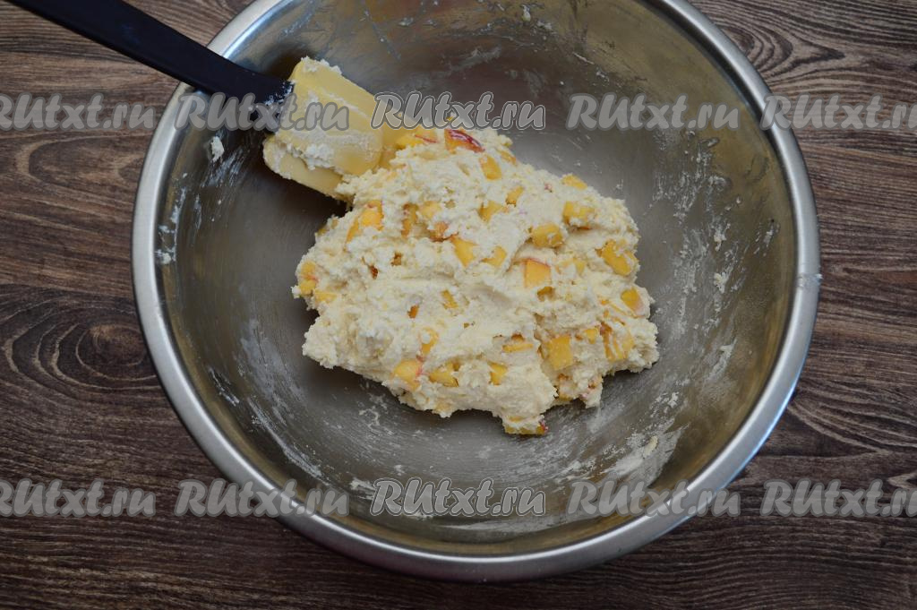 Добавить кусочки нектарина в творожное тесто и вмешать их при помощи лопатки.