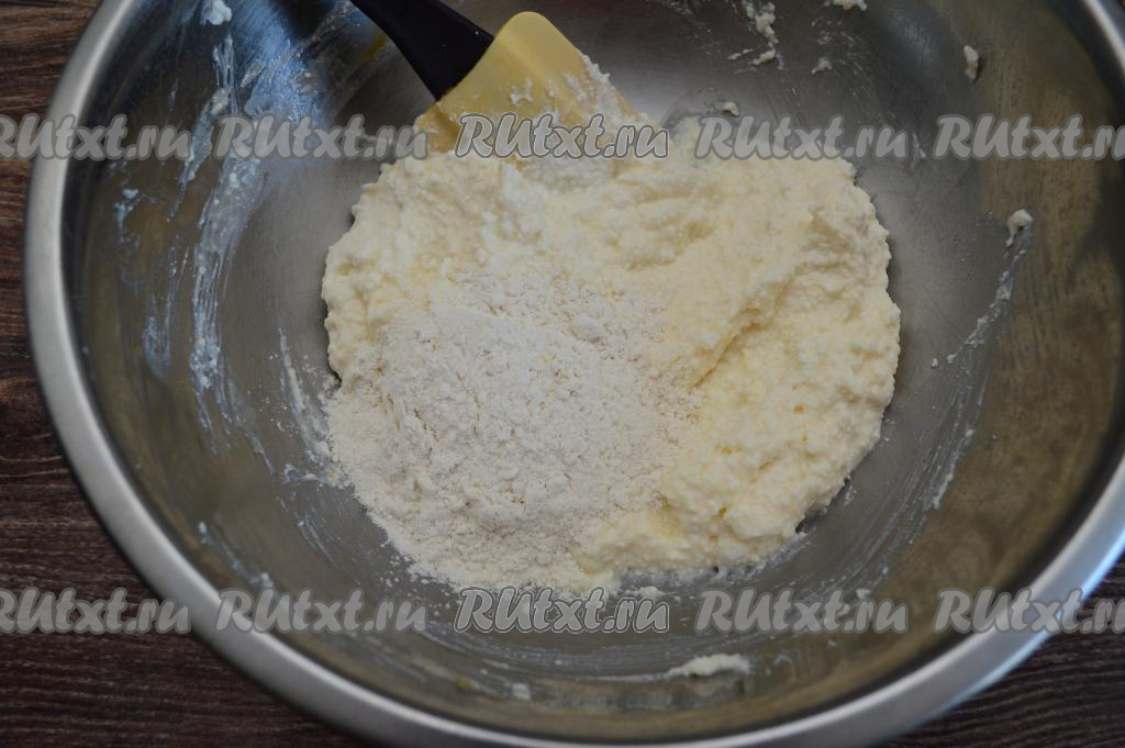 После этого добавлять по половине столовой ложки муки, каждый раз полностью вмешивая её и контролируя густоту замешиваемого теста. Всыпая понемногу муку, учитывайте, что у вас должно получиться комковатое, липкое творожное тесто, но при этом оно будет держать форму, если сжать его в ладони.