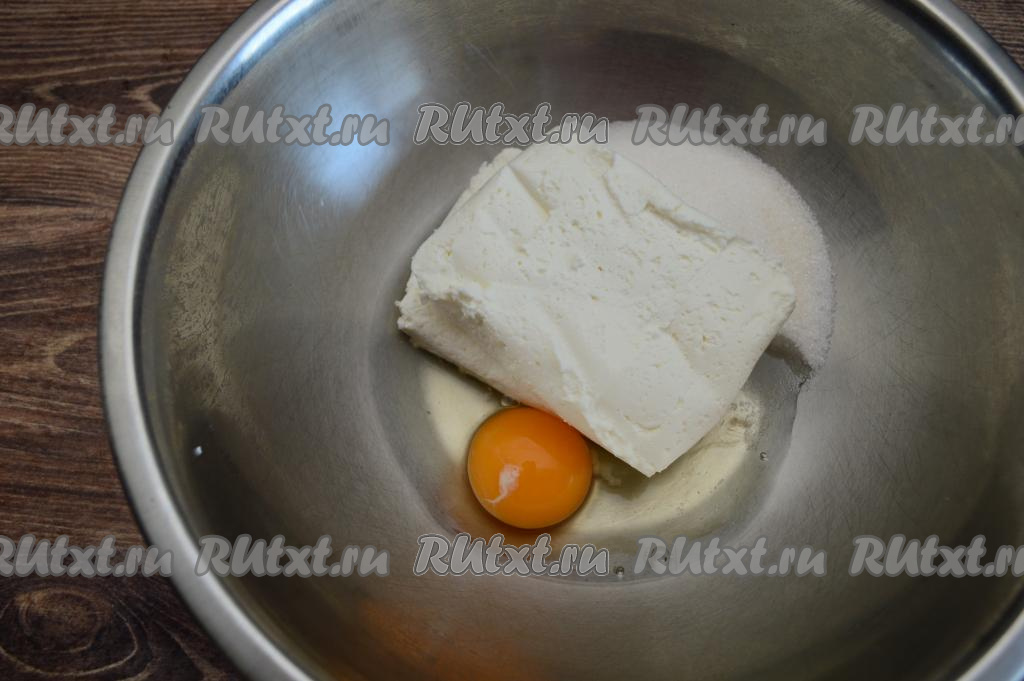 В глубокую миску выложить творог, всыпать сахар, вбить сырое яйцо.