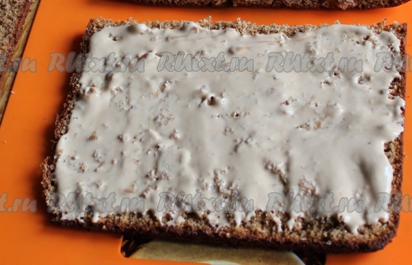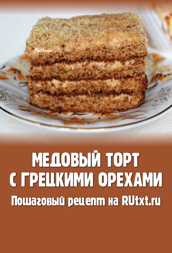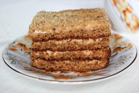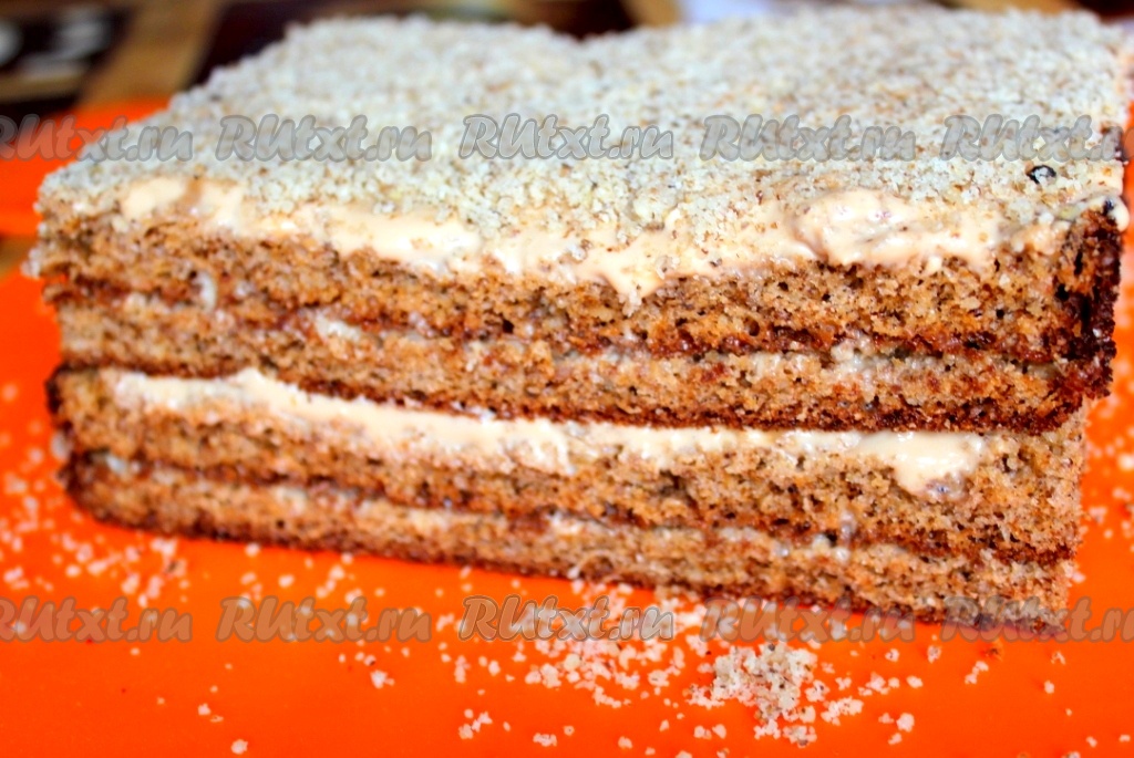 Промазать кремом коржи и собрать медово-ореховый торт.