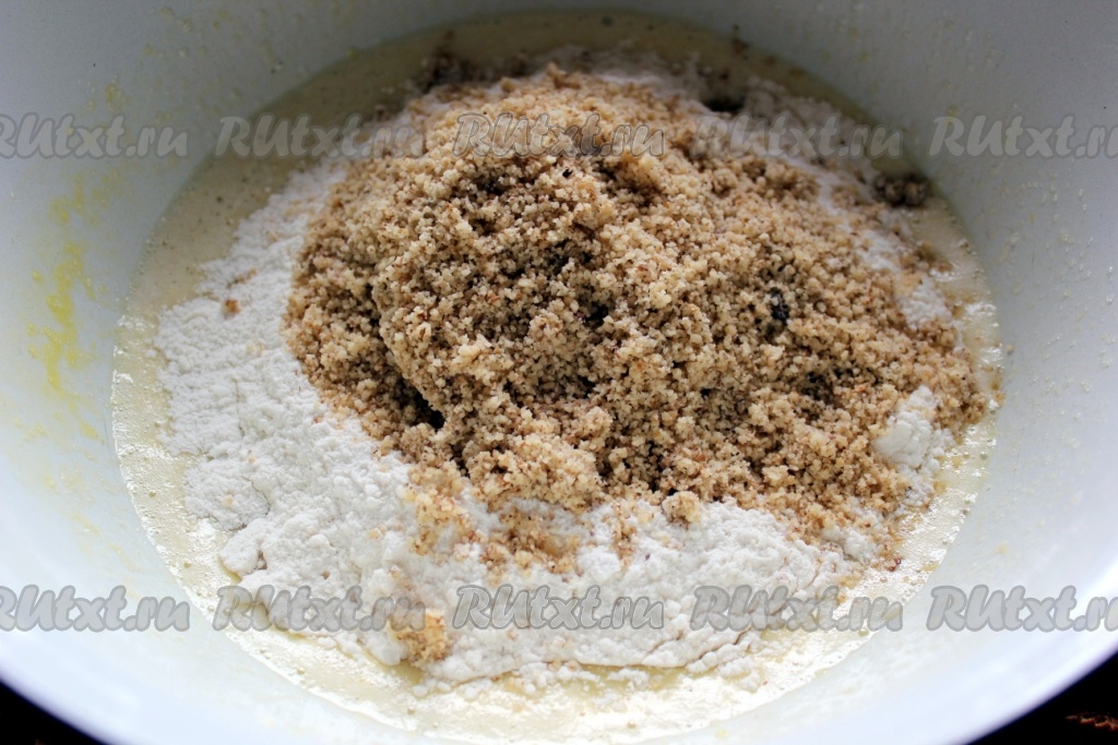 Грецкие орехи измельчить. Соединить сахарно-яичную смесь с мукой, крахмалом, содой, солью и грецкими орехами и всё тщательно перемешать. Тесто получается, как густая сметана.