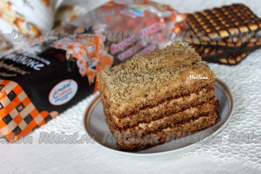 Печенье измельчить в блендере или скалкой и обсыпать им бока торта. Верх медового торта посыпать тоже печеньем или измельченными грецкими орехами.