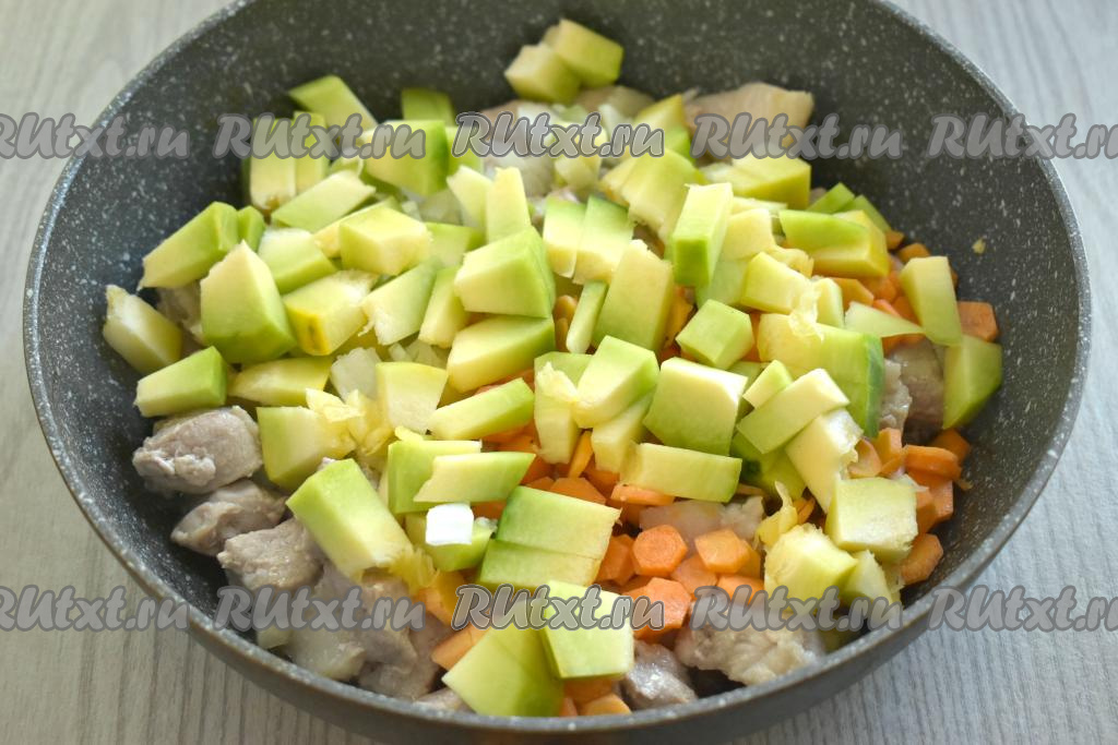 Сразу добавляем очищенную тыкву (у меня - тыква с мякотью зелёного цвета), нарезанную на небольшие кусочки. Перемешиваем овощи с мясом и обжариваем на среднем огне 10 минут (до мягкости моркови и тыквы), не забывая время от времени помешивать.