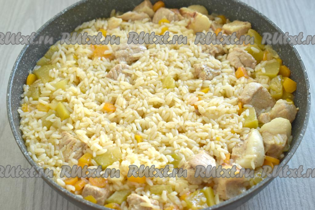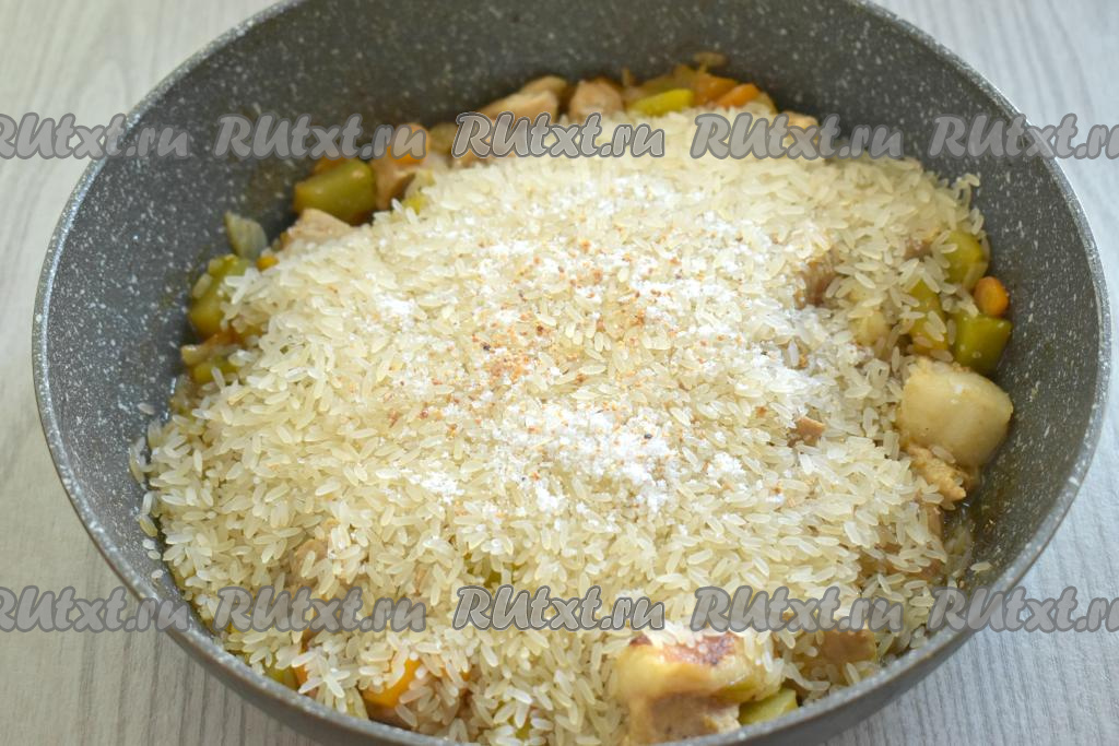Затем к мясу с овощами всыпаем рис, солим, добавляем специи (я всыпала 0,5 чайной ложки сушёного чеснока).