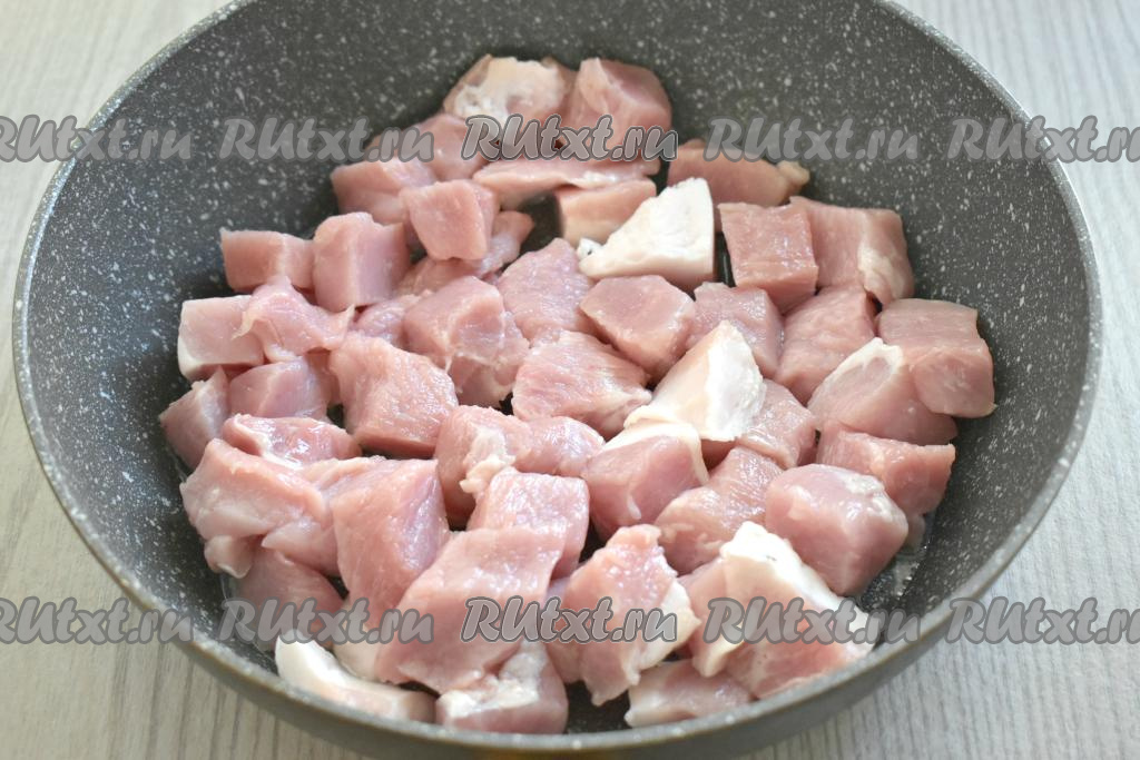 Готовить плов я предпочла в глубокой сковороде (но можно готовить и в казане или в кастрюле с толстым дном). Рис промываем проточной водой, откидываем на дуршлаг, чтобы лишняя вода стекла. Очищаем лук и морковь. Мякоть свинины моем, обсушиваем, нарезаем на кубики со стороной примерно 2 сантиметра. В сковороде разогреваем растительное масло, выкладываем нарезанное мясо и обжариваем его на достаточно сильном огне в течение 8-10 минут (до лёгкого подрумянивания со всех сторон), периодически перемешивая.