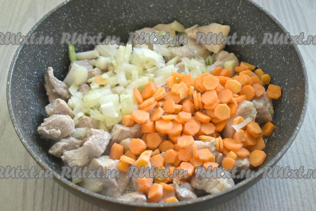 К обжаренному мясу выкладываем мелко нарезанный лук и нарезанную на достаточно тонкие кружочки (или брусочки) морковку.