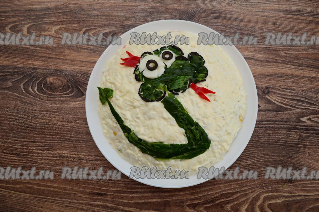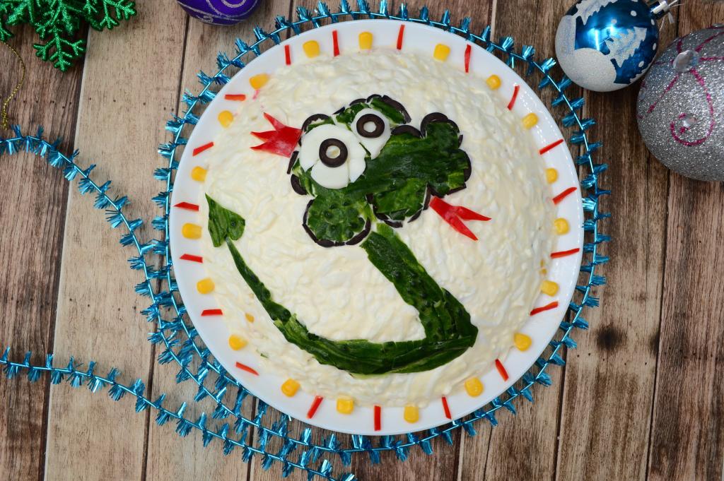 Теперь можно приступать к оформлению новогоднего салата. Для этого из маслин, нарезанных на тонкие полоски, нужно сформировать контур головы. Середину контура заполнить ранее отложенными кусочками кожуры огурца. Белки глаз вырезать из яичных белков, выложить поверх кожуры. Зрачки сделать из маслин. Тело и хвост змеи будут зелёными, выложить их из кожуры огурца. Корону и язык вырезать из болгарского перца и разместить на салат.