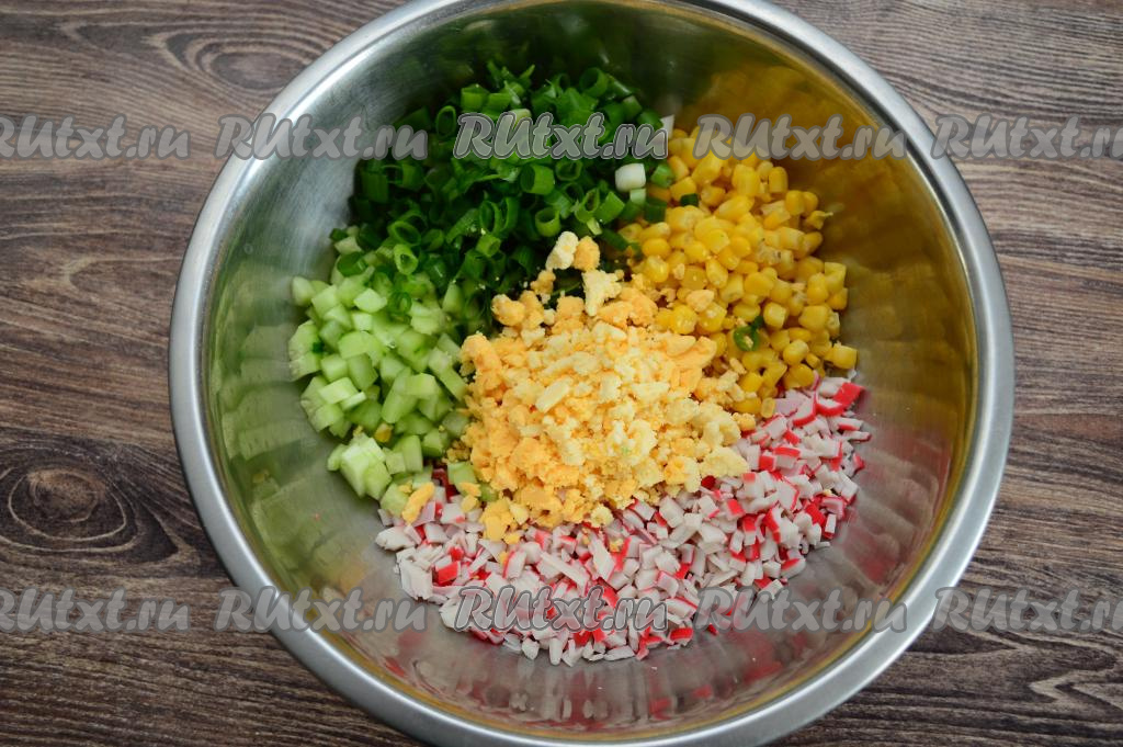 В глубокий салатник выложить крабовые палочки, зелёный лук, огурцы, желтки и консервированную кукурузу без жидкости. 1 столовую ложку кукурузы заранее отложите для украшения.