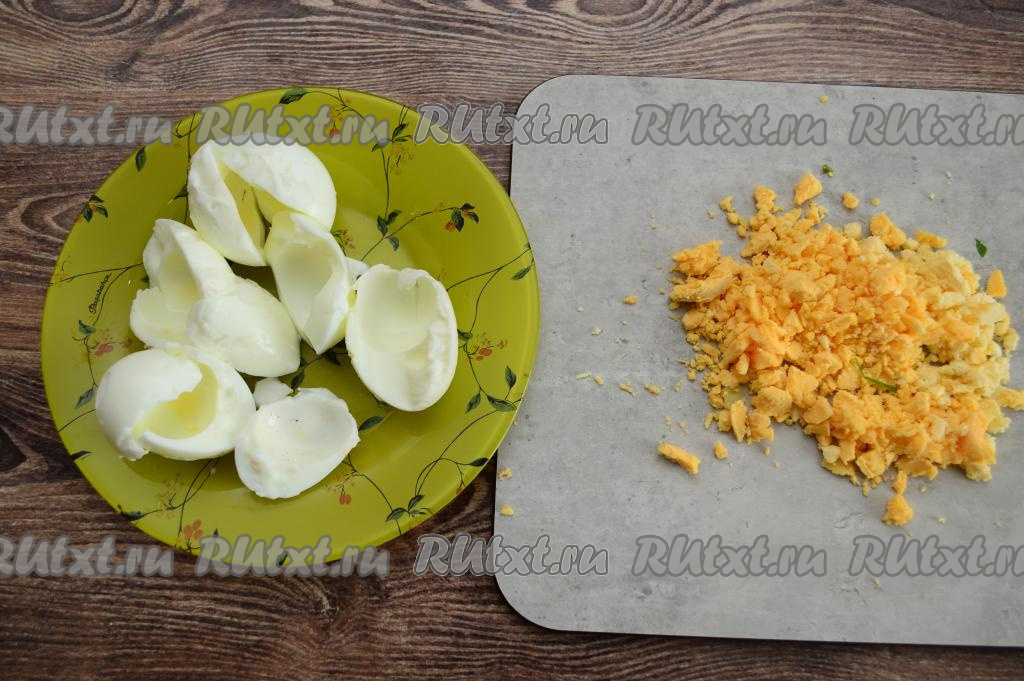 Яйца заранее отварить вкрутую (то есть в течение 10 минут с момента закипания воды), остудить, очистить. Разделить варёные яйца на желтки и белки. Белки нам потребуются позже. Желтки размять вилкой (или раскрошить ножом).