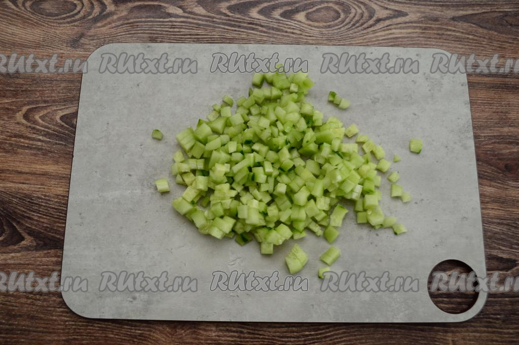 С огурцов снять кожуру при помощи овощечистки. Отложить кожуру в сторону, она нам потребуется для оформления салата в виде змейки. Огурцы тоже нарезать на мелкие кубики.
