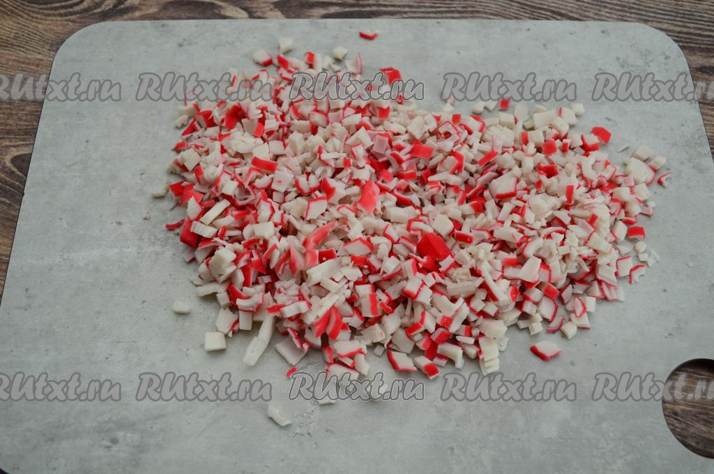 Крабовые палочки разморозить, очистить от слюды и нарезать на мелкие кубики.
